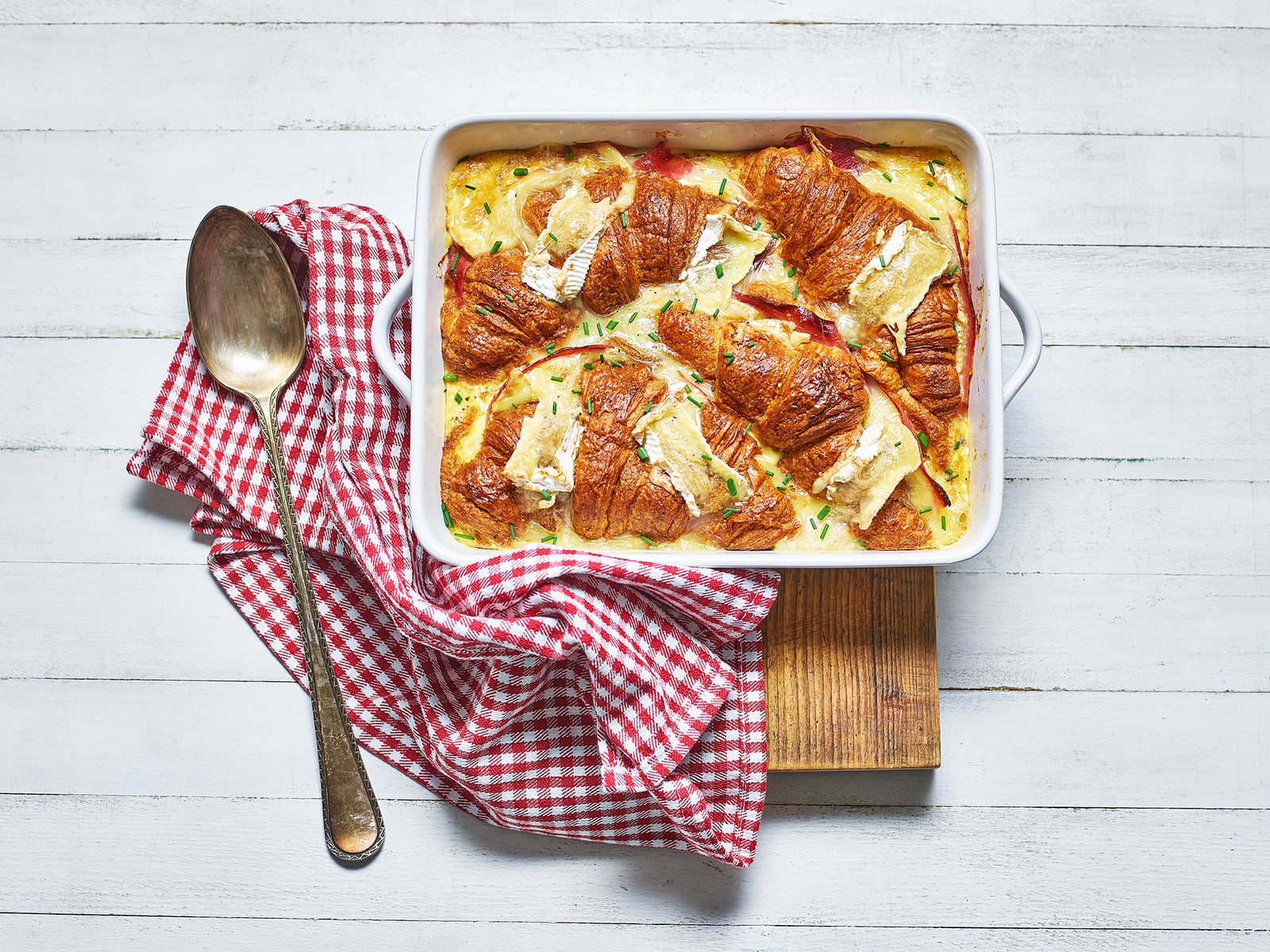 Preheat the oven to 200oC/Fan 180oC/Gas 6. Arrange the remaining cheese slices on top of the croissant. Stand the dish in a roasting tin and pour boiling water from the kettle to come halfway up the outside of the dish. Bake for 20-25 minutes or until the egg mixture has set. Scatter with chives and serve hot.