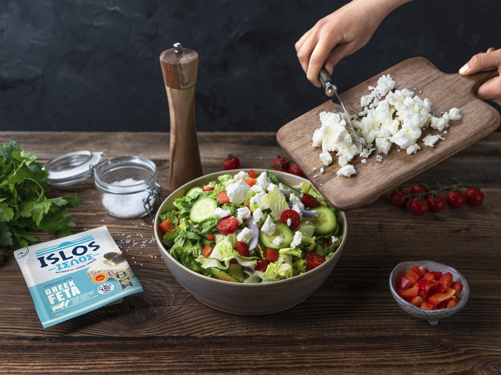 Place the whole ISLOS feta on the salad and pour the remaining tbsp of olive oil. Garnish with dried oregano.