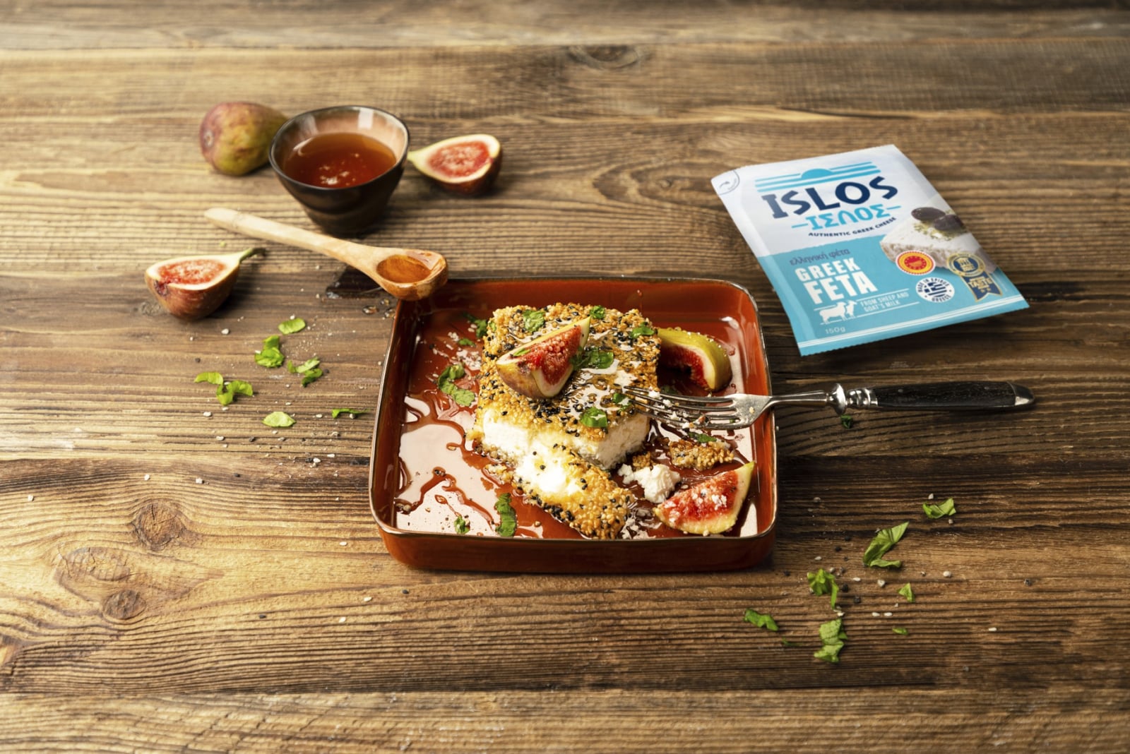 1. For the baked feta: Divide ISLOS feta into four equal pieces. Prepare three plates, one with flour, the second with a beaten and whisked egg and the third with a mix of white and black sesame seeds. Now carefully roll the cheese pieces one by one in flour, pull them through the egg mixture and coat them with sesame seeds.