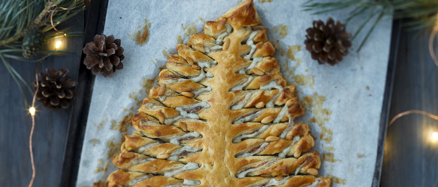 Lightly brush the topside of the tree with the rest of the egg yolk, sprinkle the branches of the tree with the pine nuts, and bake for 25 min in the oven until golden brown. Enjoy warm, perfect for an aperitif.