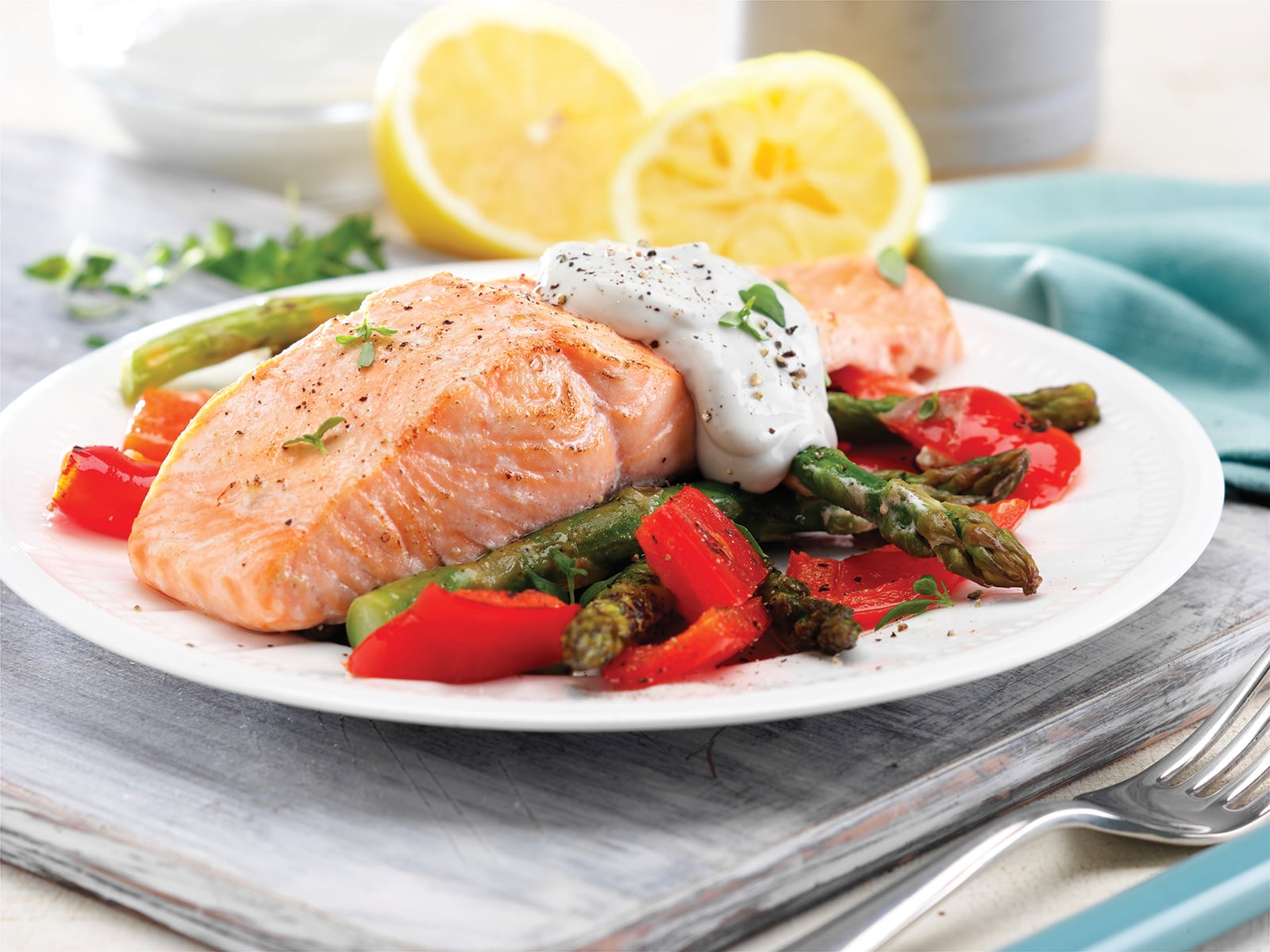 Serve the salmon on a bed of vegetables with a dollop of Saint Agur® Blue Cheese Crème and a few thyme leaves.