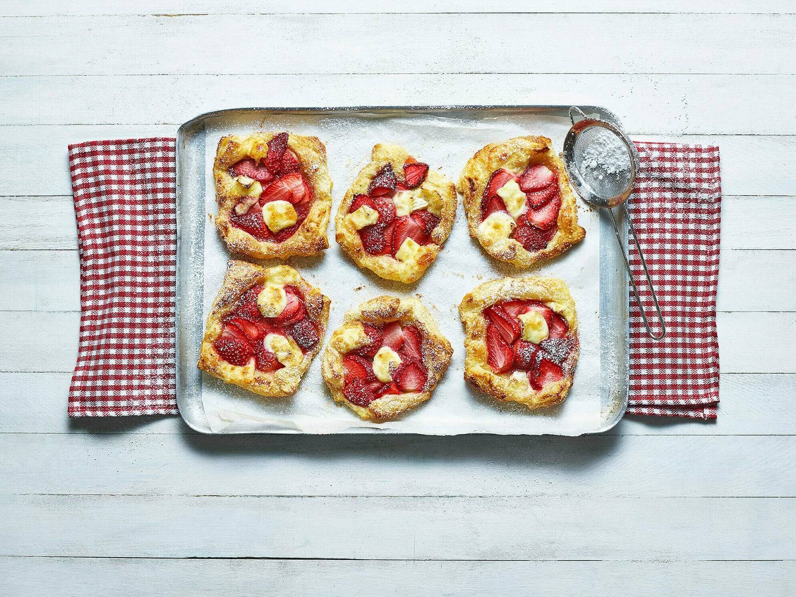 In a bowl, mix the caster sugar and cornflour together, add the strawberries and toss to coat in the sugar mixture. Divide the fruit between the pastry squares, heaping it in the middle. Scatter over the remaining cubes of Brie.