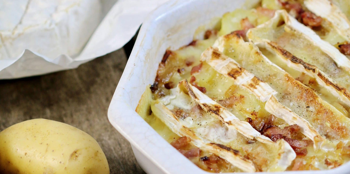 Place half the camembert in the dish, and repeat the process with the remaining ingredients (potatoes, onions and lardons).