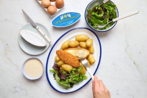 Cut pieces of cheese lengthwise. Distribute the elements nicely in the cones, add the lettuce leaves.